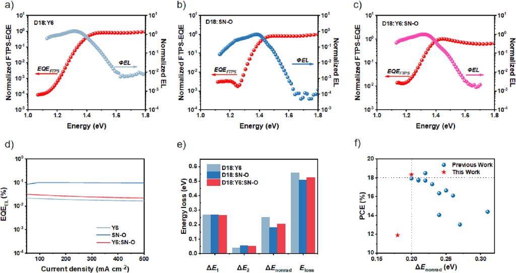 通过“双不对称策略”设计了一种新的不对称非富勒烯受体SN-O;SN-O表现出较大的偶极矩和上升的LUMO和HOMO能级;D18:Y6:SN-O三元体系的分子排列更加有序,结晶度增强,具有纤维状纳米结构。实现了0.202 eV的低非辐射能量损失,这是PCEs超过18%的基于D18的OSCs的最低值之一。